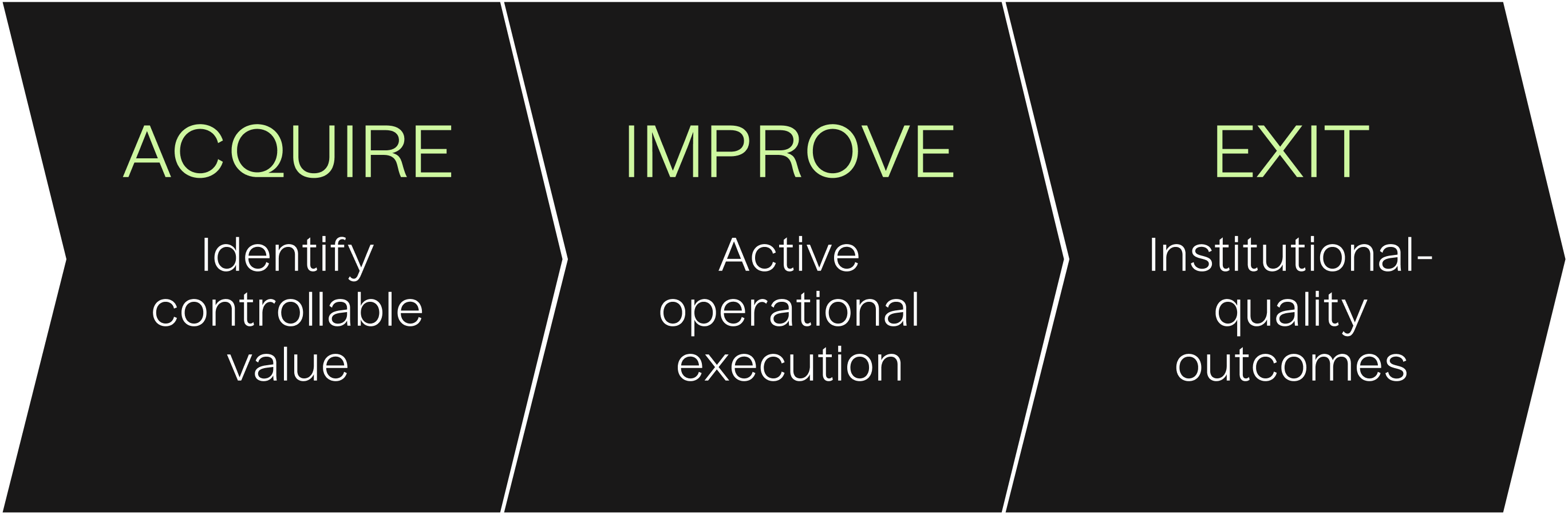 Our strategy is applied across the full investment lifecycle — from acquisition through execution to exit — with a focus on controllable drivers of performance: