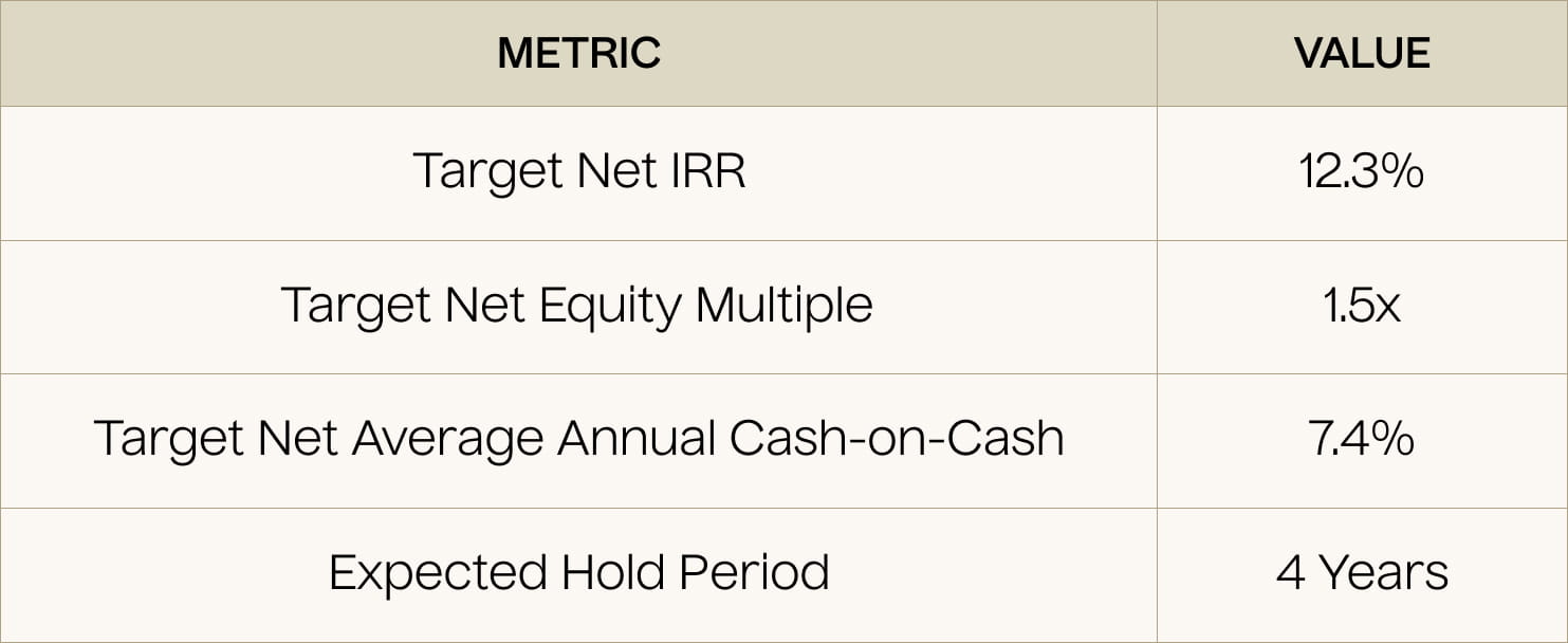 In a hypothetical $200,000 investment, an LP could earn a net profit of $103,041, with projected net cash flow over the hold totaling enough to support the targeted 1.5x net equity multiple and 12.3% net IRR.