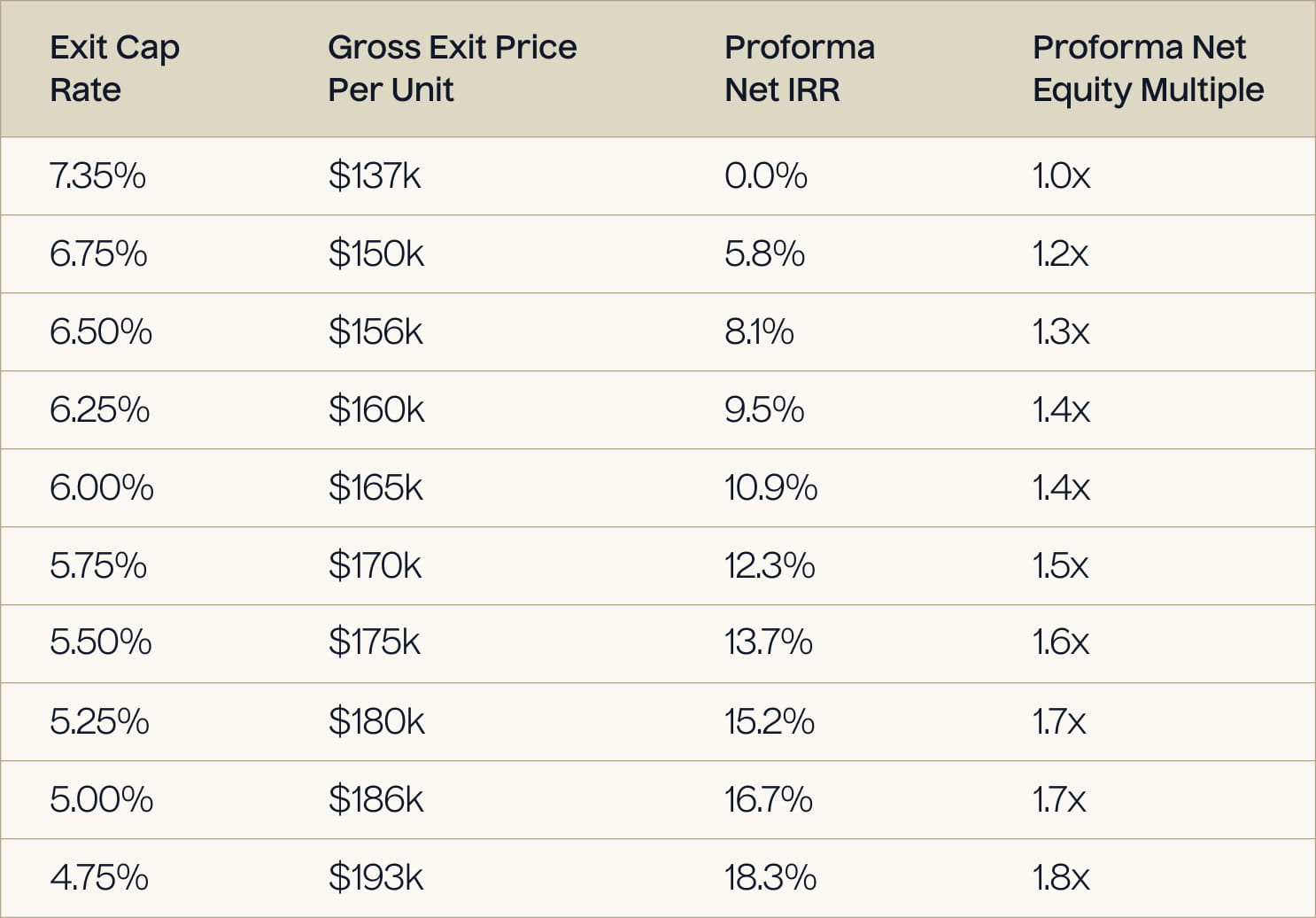 For Hidden Lakes, the exit cap rate is underwritten at 5.75%. While not immediately relevant to an LP’s net returns, it materially shapes the projected exit value and therefore the IRR and equity multiple.